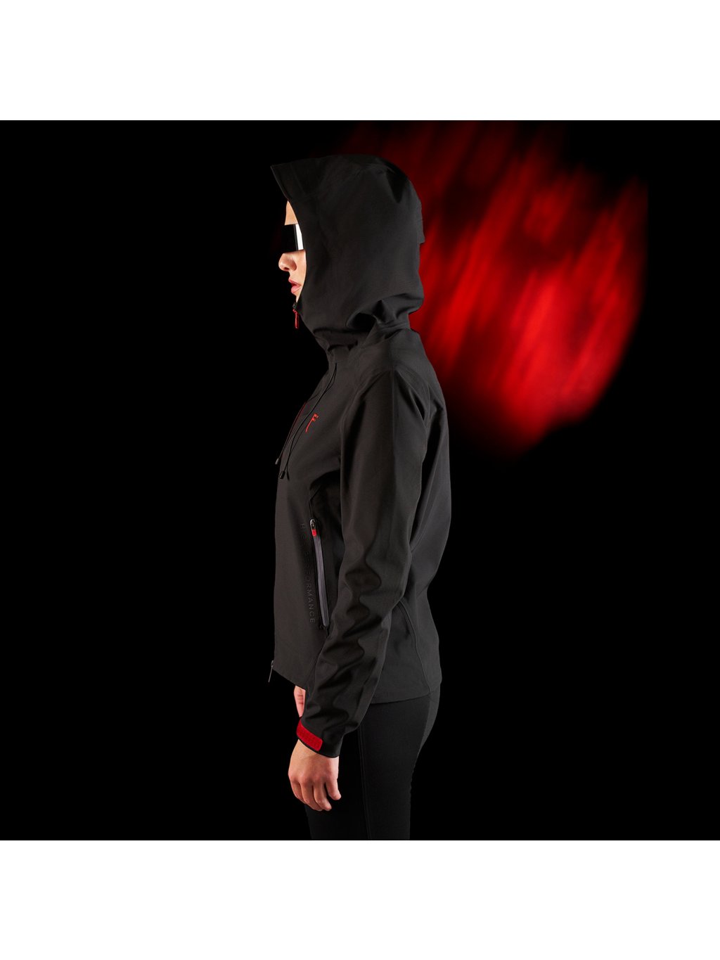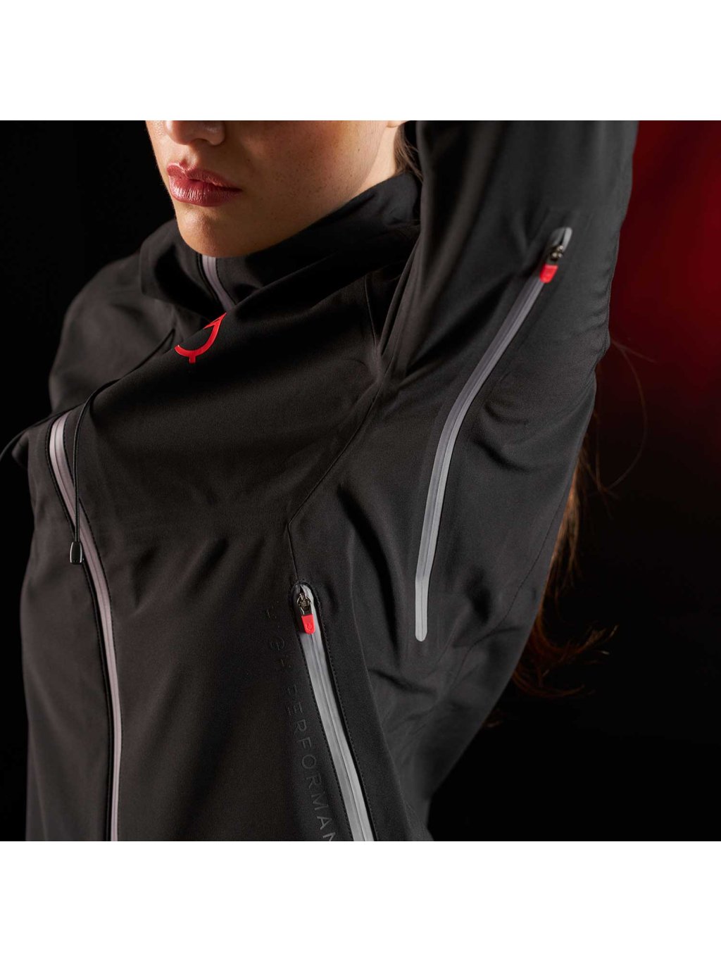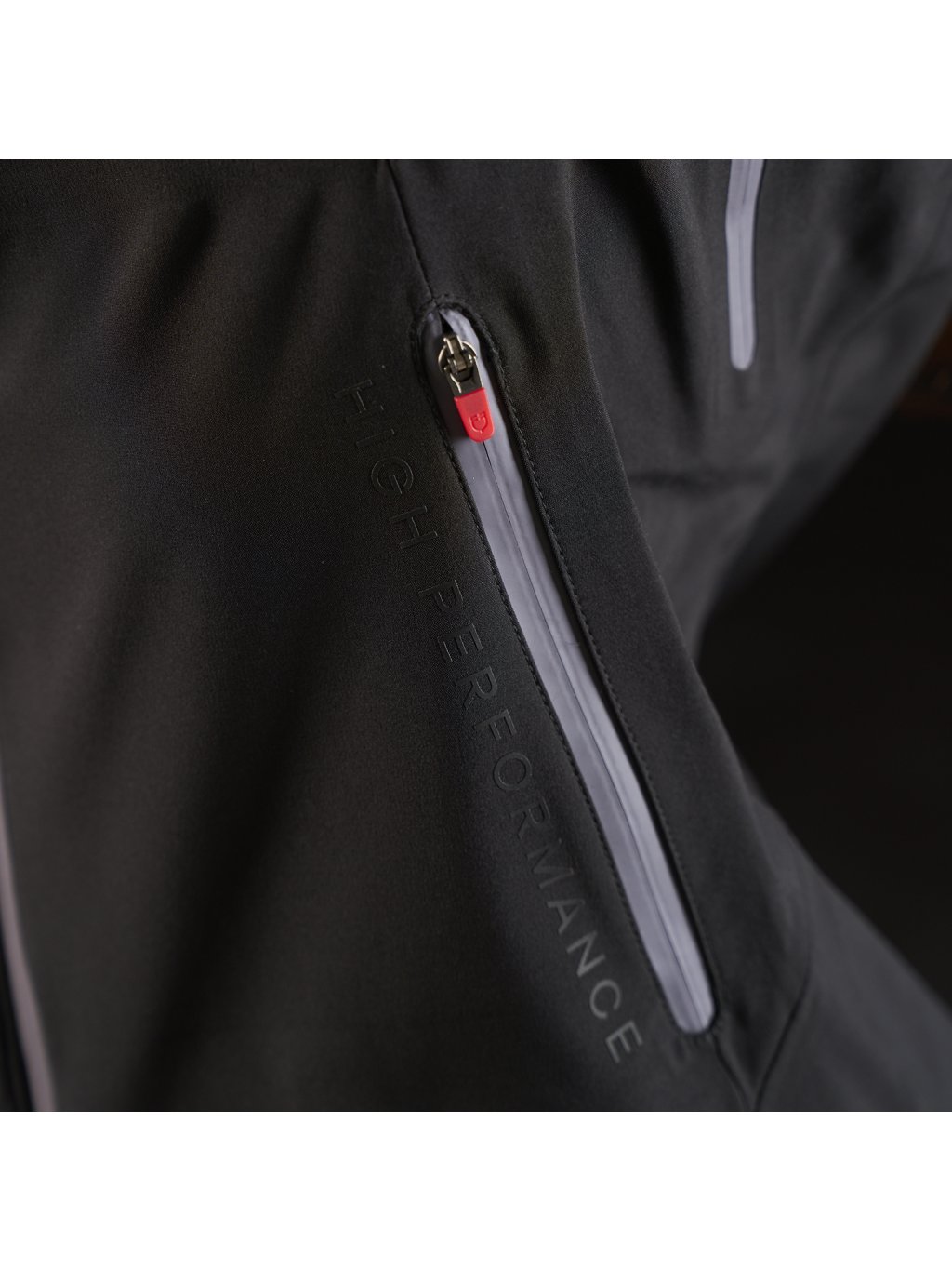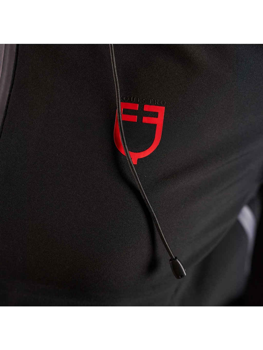 Bunda má praktickou nastavitelnou kapuci, přední zapínání a kapsy s větruodolnými zipy. Na koncích rukávů jsou nastavitelné pásky pro dokonalé přizpůsobení. Pro lepší odvětrávání a odvod potu je bunda vybavena čtyřmi dalšími zipy – dvěma na rukávech a dvěma po stranách. Ikonické logo Equestro Ridertechnology v sytě červené barvě zdobí levou stranu hrudi, zatímco perforované logo Equestro je umístěno na zádech.