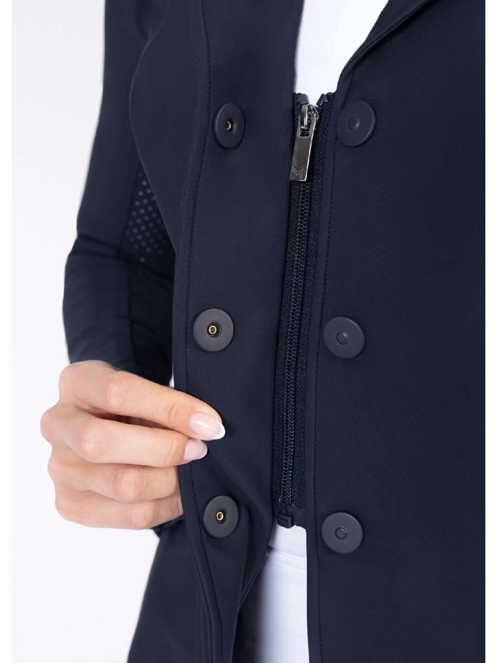 Dvojité zapínání: skrytý zip krytý odolnými magnetickými knoflíky zajistí, že sako perfektně drží během celé jízdy