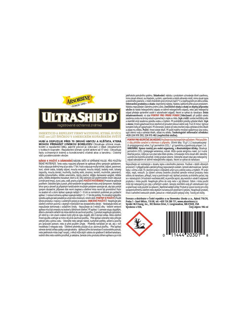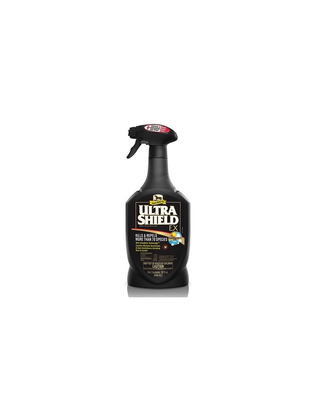 UltraShield® EX Insecticide & Repellent se nevypotí, je voděodolný, nemastný a jeho prodloužený účinek, běžně zajišťovaný tzv. slunečními krémy pod různými obchodními názvy, je zde posílen použitím rovnou dvou takových. Obsahuje také výtažky z aloe a lanolinu. Odpuzuje a zabíjí široké spektrum hmyzu, od otravných much a mušek, přes moskyty, komáry, pakomárce (Culicoides), klíšťata, blechy, kloše, muchničky, tiplíky, vši...