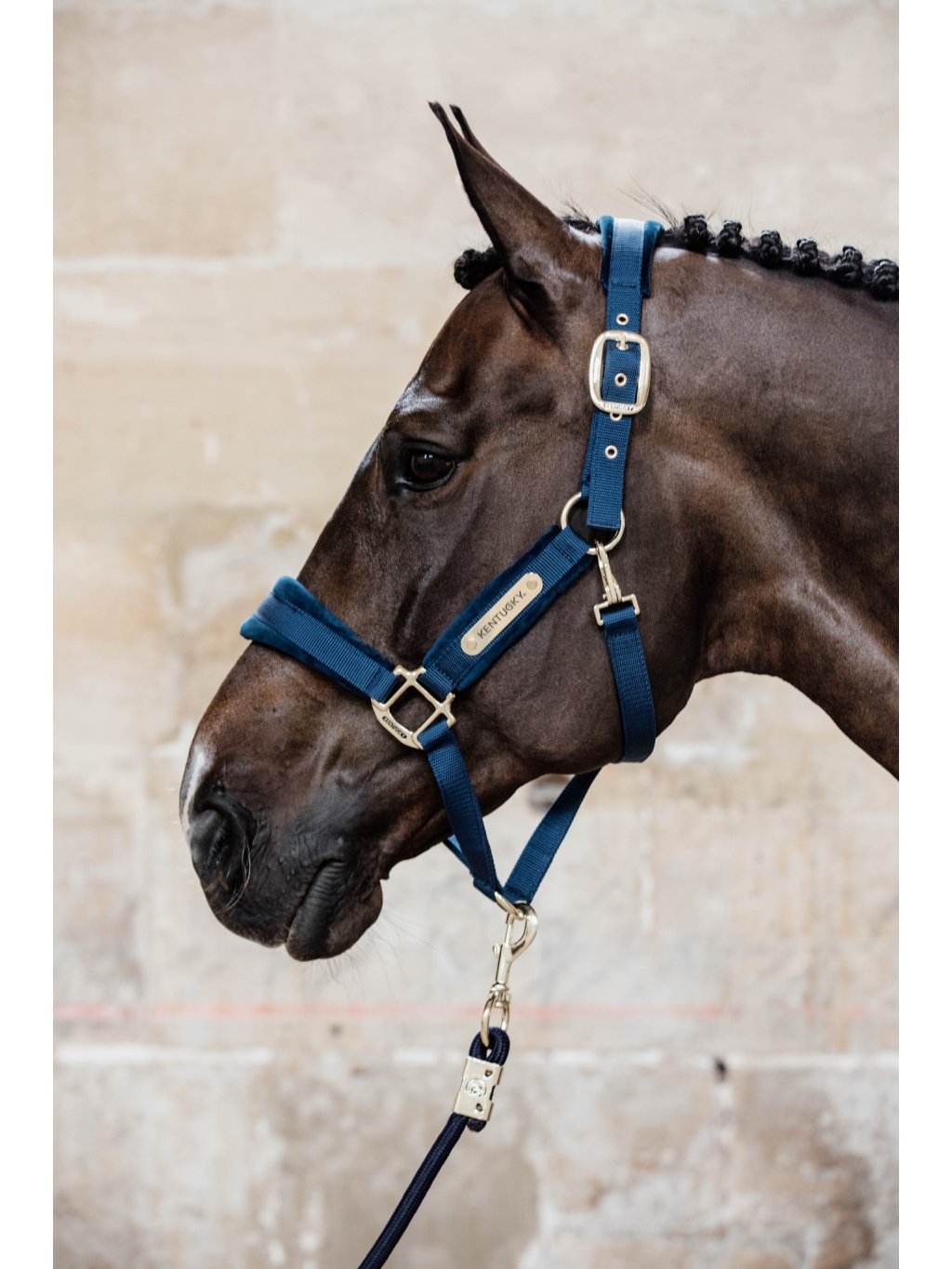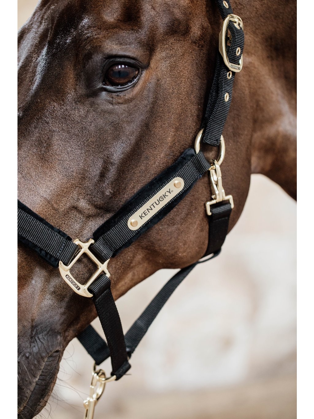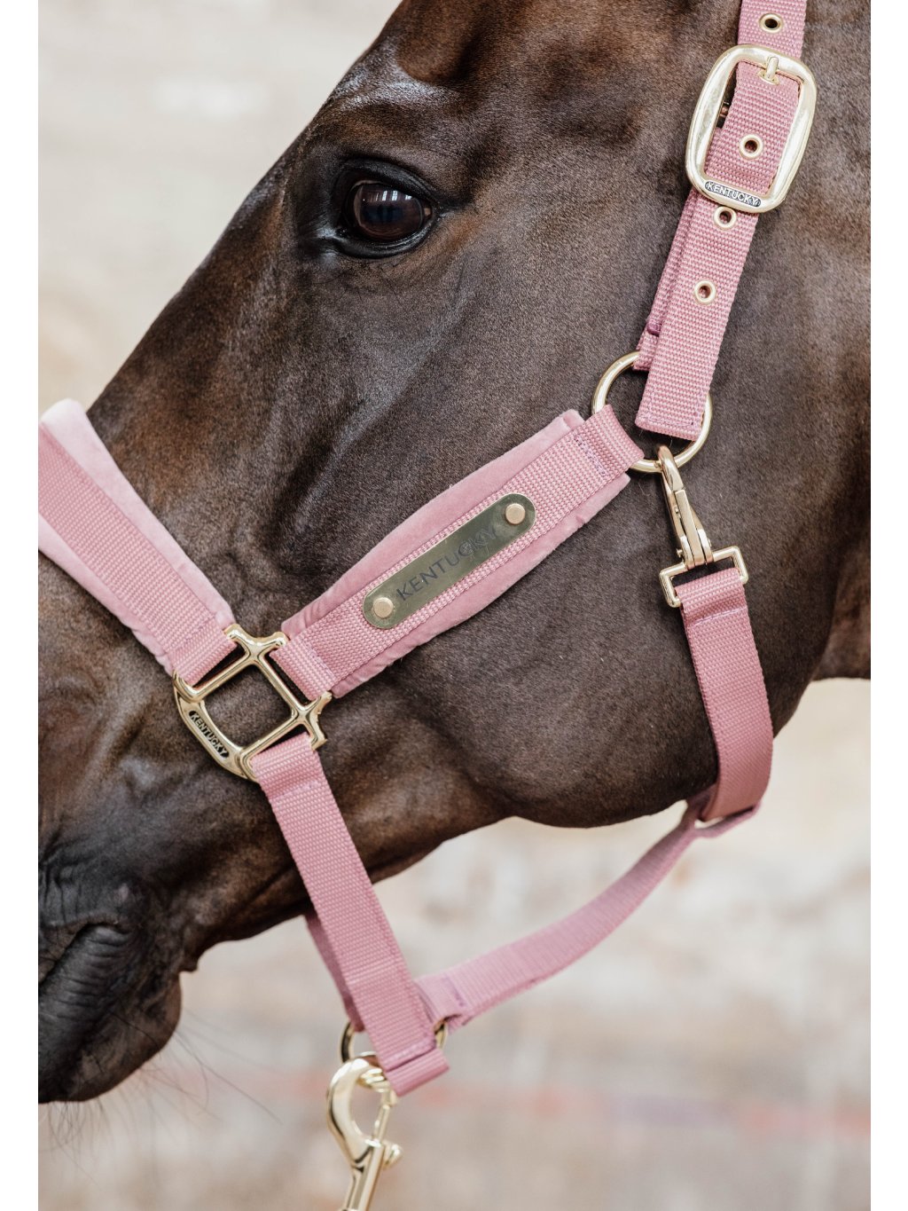 Ohlávka je vyrobena z odolného nylonu, který zajišťuje maximální bezpečnost vašeho koně. Oblasti, kde je nejvíce potřeba pohodlí – nánosník, lícnice a nátylník – jsou opatřeny měkkým sametovým polstrováním. To je nejen hebké na dotek, ale také příjemné při nošení. Stylový vzhled podtrhuje zapínání se zlatou mosaznou karabinou. Díky možnosti nastavení na obou stranách nátylníku se ohlávka dokonale přizpůsobí každému koni.