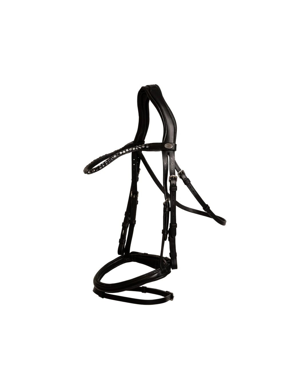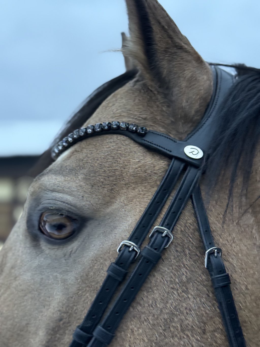 Tato anatomická uzdečka od Dy`on nabízí eleganci i funkčnost v jednom. Vyrobeno z měkké, celozrnné kůže pro prémiový pocit a dokonalé anatomické přizpůsobení. Obsahuje komfortní podložku pod zapínáním, která rovnoměrně rozkládá tlak. Zdobeno čelenkou ve tvaru V s šedými krystaly Swarovski.