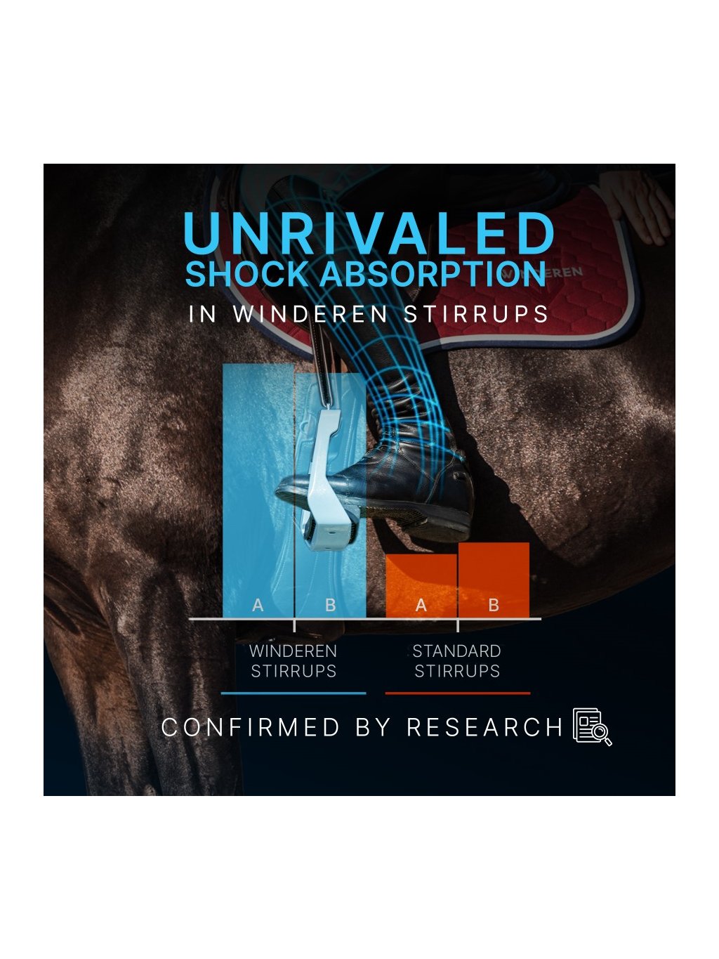 Dosažení dostatečně stabilního a pružného sedu potřebuje čas. Třmeny Winderen Double Shock Absorbing System tento proces urychlují, protože ihned zvyšují stabilitu používaných pomůcek a umožňují tak účinnější komunikaci s koněm.