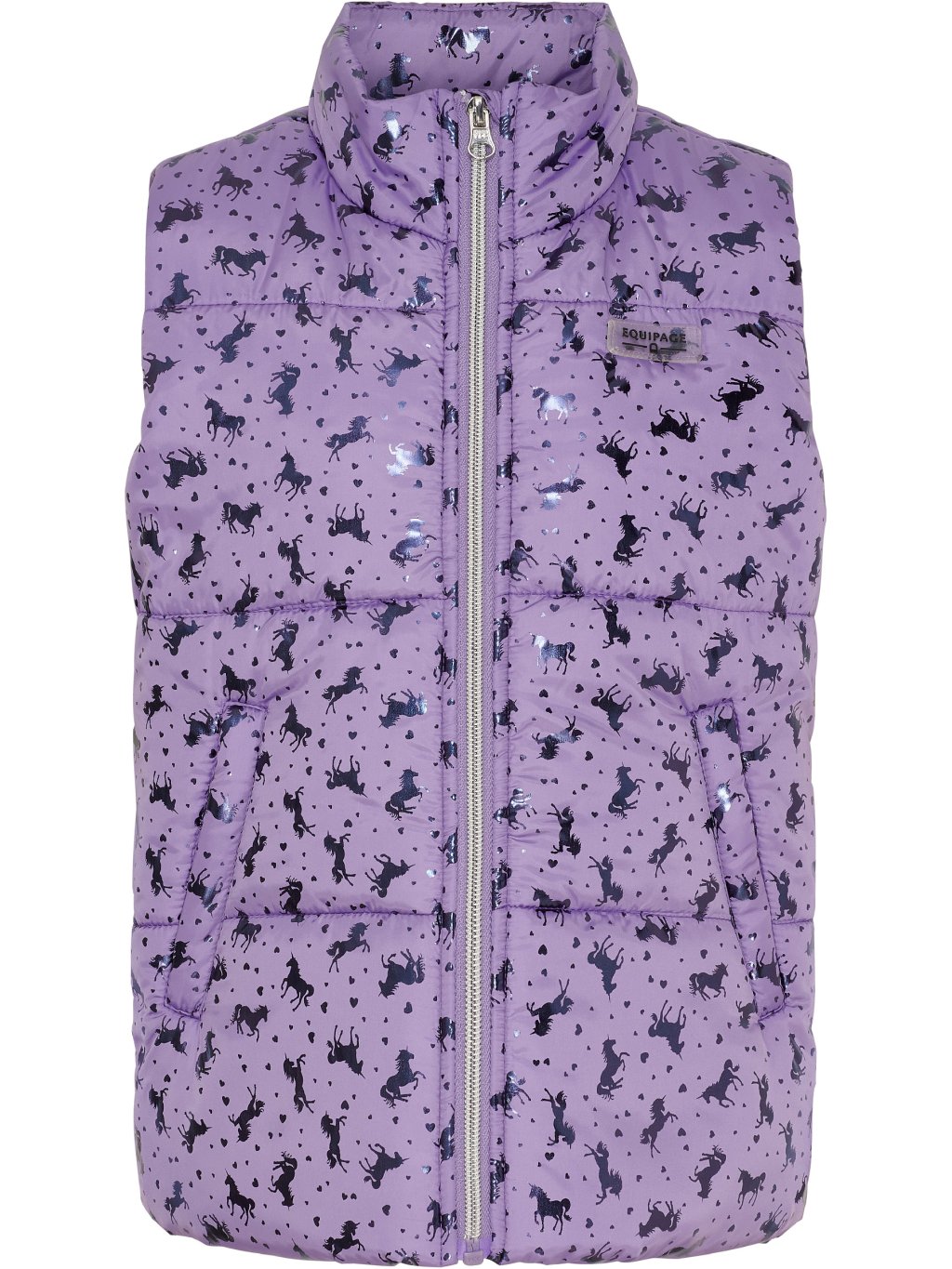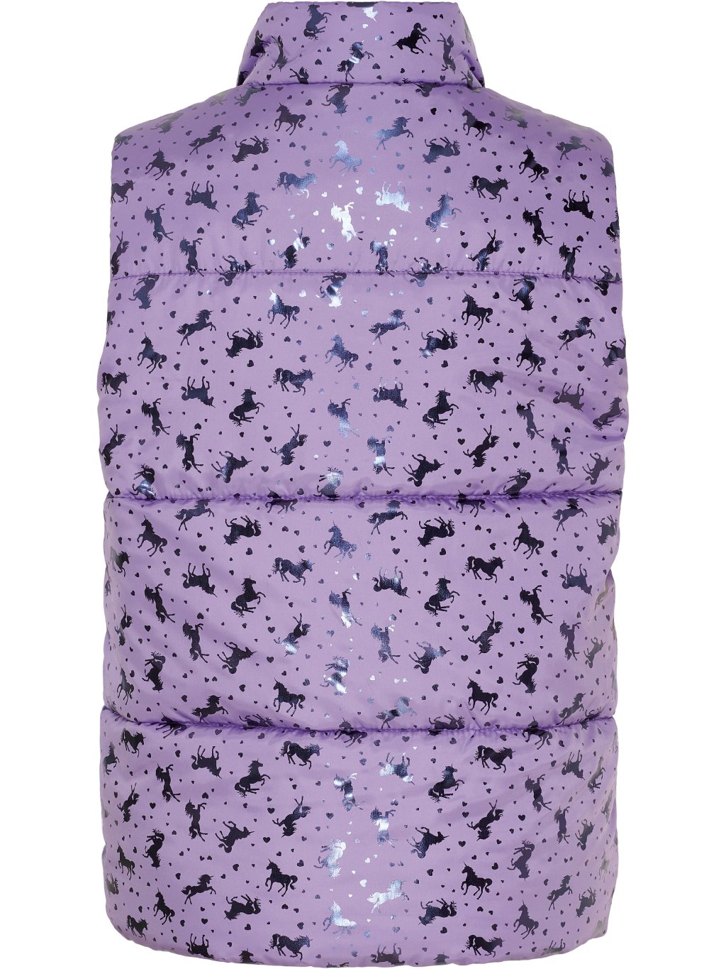 Celoplošný metalický potisk s jednorožcem dodává vestě hravý a stylový vzhled.